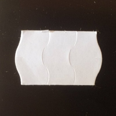 OverzichtEtiket 26x16mm wit permanent golfrand antidiefstalstanzing/veiligheidsstansing/security cuts/anti-diefstal in het etiket ( 3-delig) , doosinhoud 39.600 etiketten. ( 36 rollen à 1100 stuks) Dit is een 3-delig etiket/ driedelig.